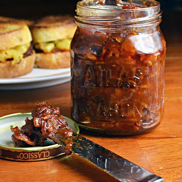 Vergessen Sie die in Zellophan eingewickelten gelben Quadrate. Dieser gegrillte Käse verwendet Mac n' Cheese für seine klebrige Füllung. Ganz zu schweigen davon, dass es mit Speckbier und Tomatenmarmelade garniert ist, was diesem köstlichen Sandwich die perfekte Portion Schiefersüße verleiht.