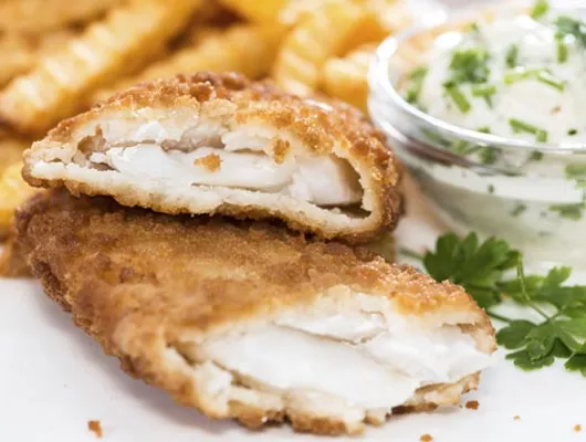 - Testen Sie, ob das Öl heiß ist, indem Sie etwas Teig hineingeben und darauf achten, dass es zischt. Sobald das Öl heiß ist, den Lachs auf beiden Seiten im Teig wenden und überschüssiges Öl abschütteln.