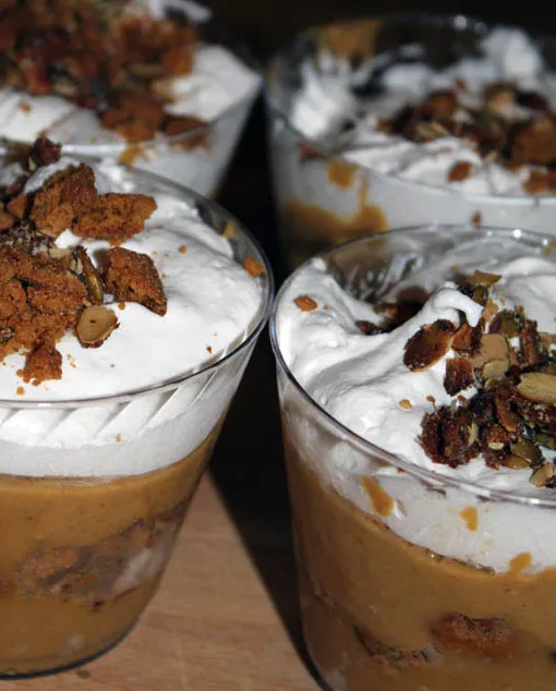 Cremiger, süß-würziger Kürbisbierpudding ist schnell und einfach zuzubereiten. In diesem Rezept verwendet The Beerista daraus Parfaits, die Schichten aus Pudding, kandierten Pepitas und zerstoßenen Ingwerschoten enthalten und mit Schlagsahne garniert sind.